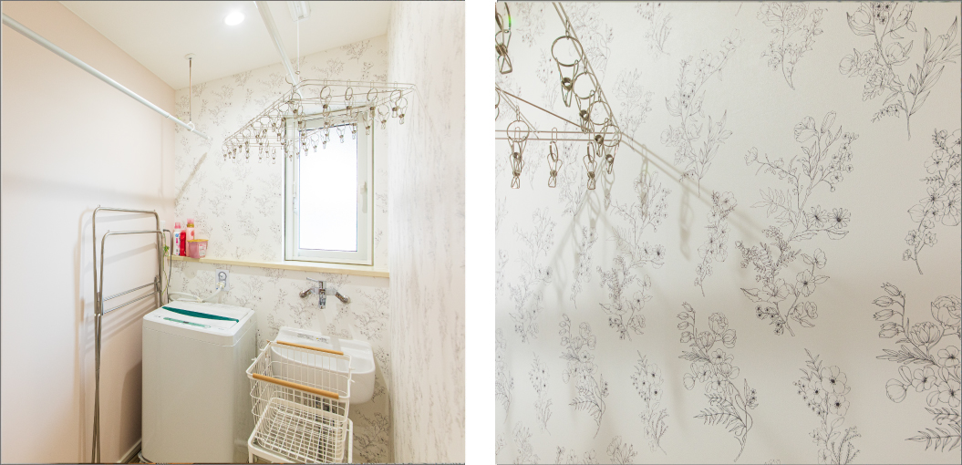 共働きなので洗濯物を日中、屋外に干せないことから、室内干しができるランドリールームを当初から計画。2本のポールに大量に干せ、除湿器で風呂場と共に一気に乾燥できます。ここの壁紙も、気分晴れやかに家事をさせてくれそうです。