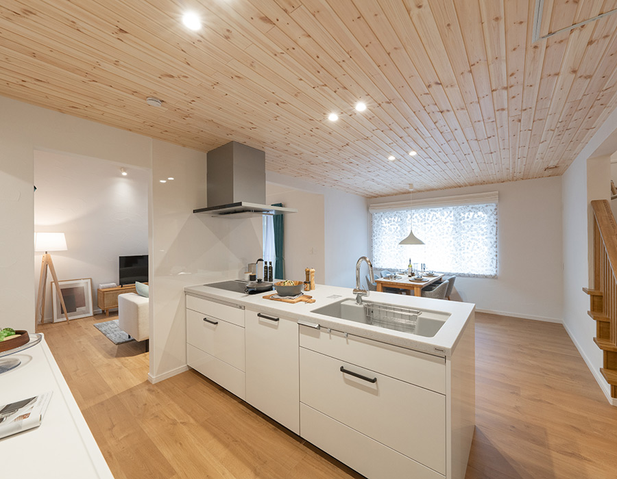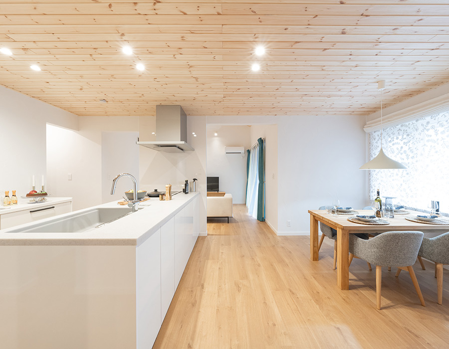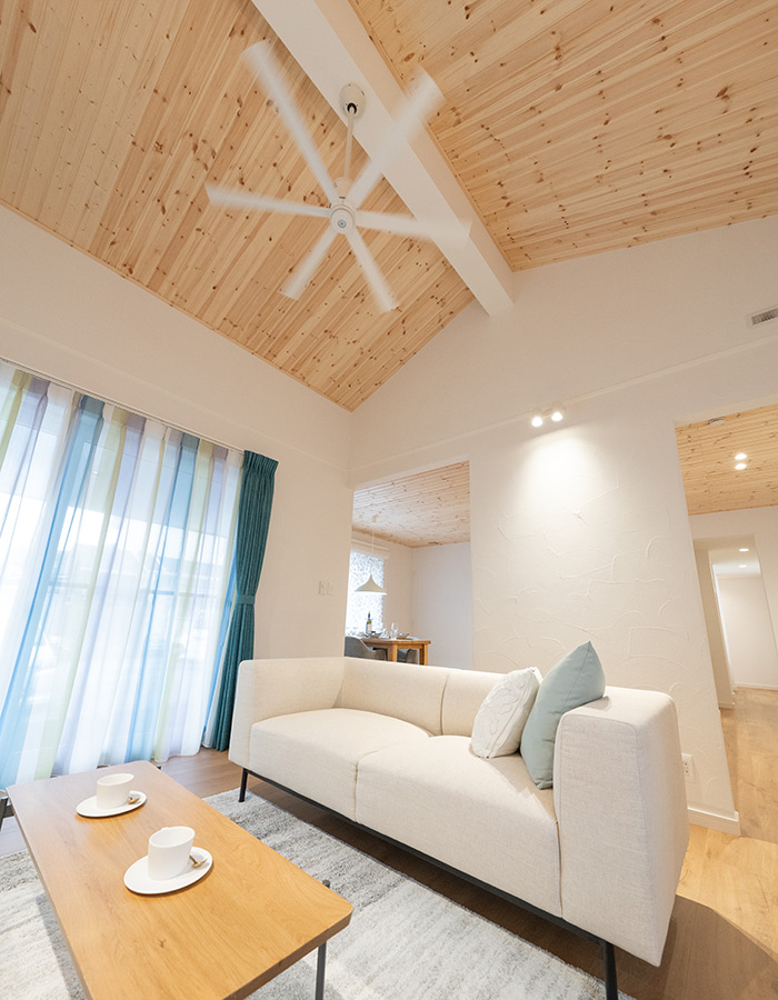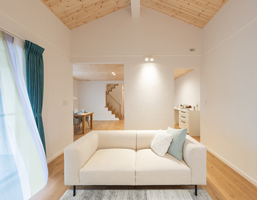 フラットな天井のダイニングキッチンと比べて天井が高いため、空間にメリハリが生まれ、より開放感を感じられる気持ちの良い空間となっています。