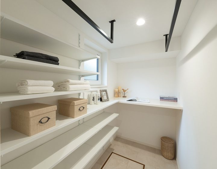 奥にはアイロンがけや畳む作業ができるカウンターも備え付け、一連の家事をこの空間で完結できます。