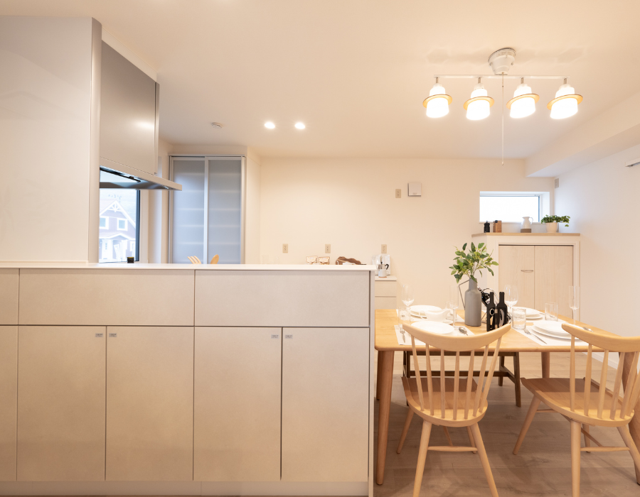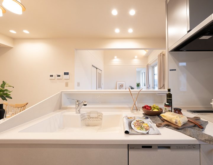 ダイニングとキッチンは横並びにし、配膳をスムーズに。お子様もお手伝いしやすいレイアウトです。