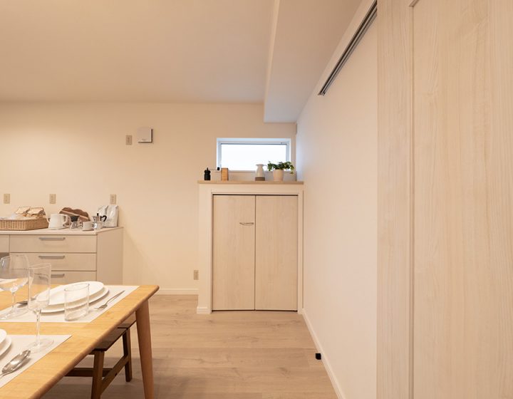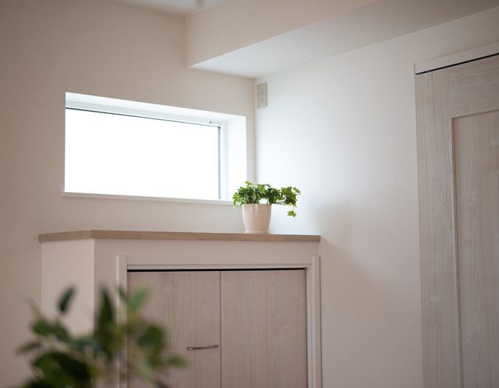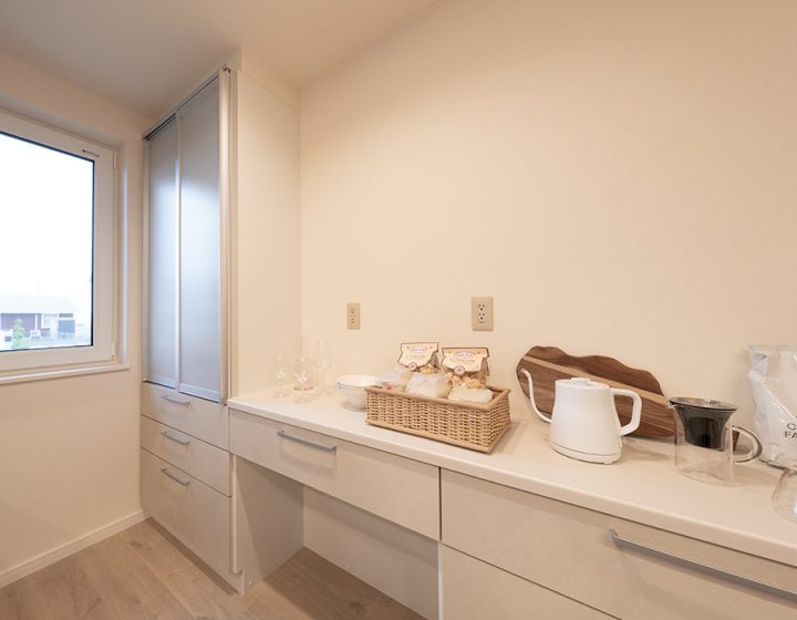 家族の食料品やネコちゃんのご飯を収納する予定ですが、実は、棚の上にもポイントがあります。棚の上に窓があるのは、高いところや外を眺めるのが好きなネコちゃんのため。