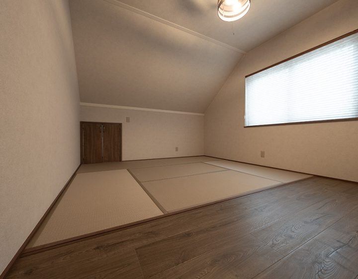 将来的には、お母さまとの二世帯同居も想定し、2階に和室を用意。ダークな色味と勾配天井で、落ち着いた空間にしています。同居するまでの間は、ゲストルームとしても使用できる、多目的なお部屋です。
