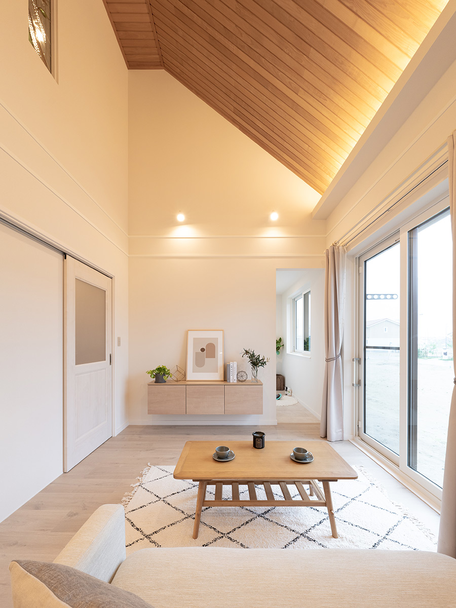 内装も、外観デザインと世界観を合わせて、優しい色味を基調としています。日中は南からのたっぷりの自然光が気持ちよく、夜は間接照明が板張りを照らし、贅沢な空間です。