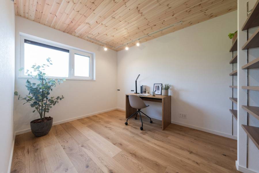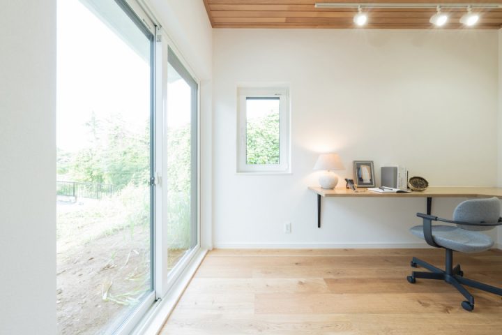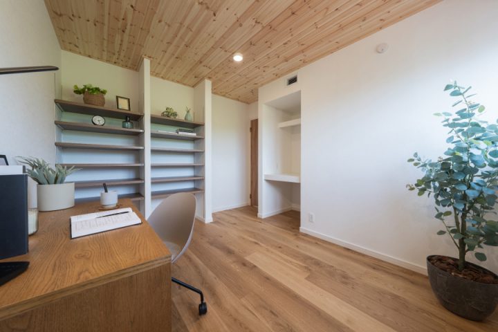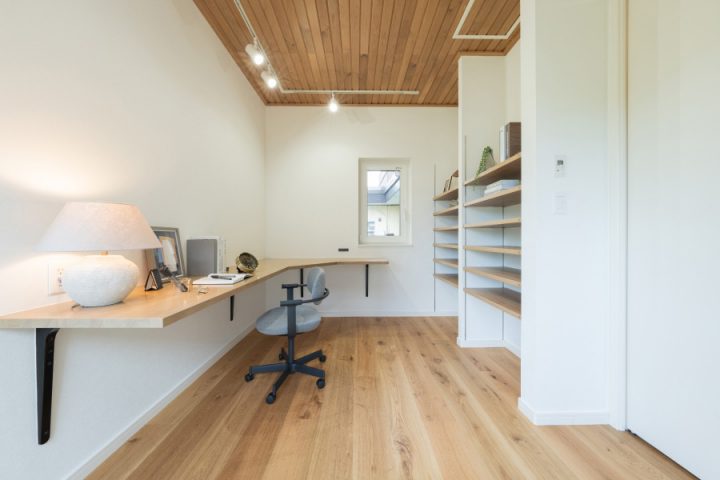 ご主人と同様にリモートワークが中心の奥様は、2階に専用の書斎を設けました 。天井には板張りを、床には無垢材を使用し、自然素材に包まれた心地よい空間です。