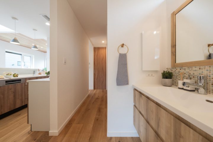 さらに、その先には洗面化粧台、キッチン、そして脱衣室へとアクセスできる生活動線が続きます。