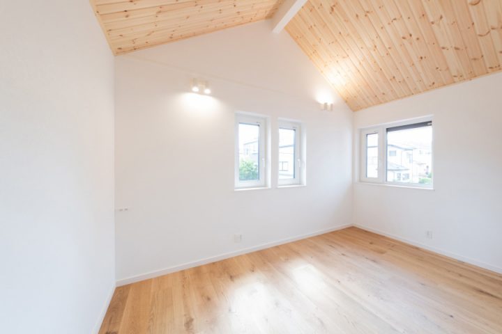 2階に設けられた子供部屋も、無垢の床材と天井板張りを採用。船底天井による開放感と2面採光による明るさも相まって、お子様が大きくなってからも、長く使い続けられる上質な空間になりました。