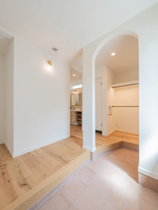 玄関を入ると、アーチ壁が可愛らしいシューズクロークがお出迎え。床が斜めにカットされているため、家に入ってからスムーズに靴をしまえます。