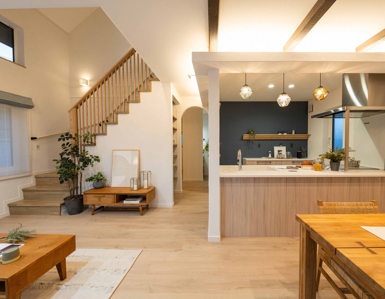 キッチン後ろのアクセントウォールや飾り棚、天井の化粧梁など、奥様の「好き」をふんだんに盛り込んだ空間は、どこを切り取っても絵になります。ダイニングに座れば、ペンダントライト越しに飾り棚やキッチン横のスリットまで見渡せ、左側には自然の光をたっぷりと取り込む大きな窓が配されています。