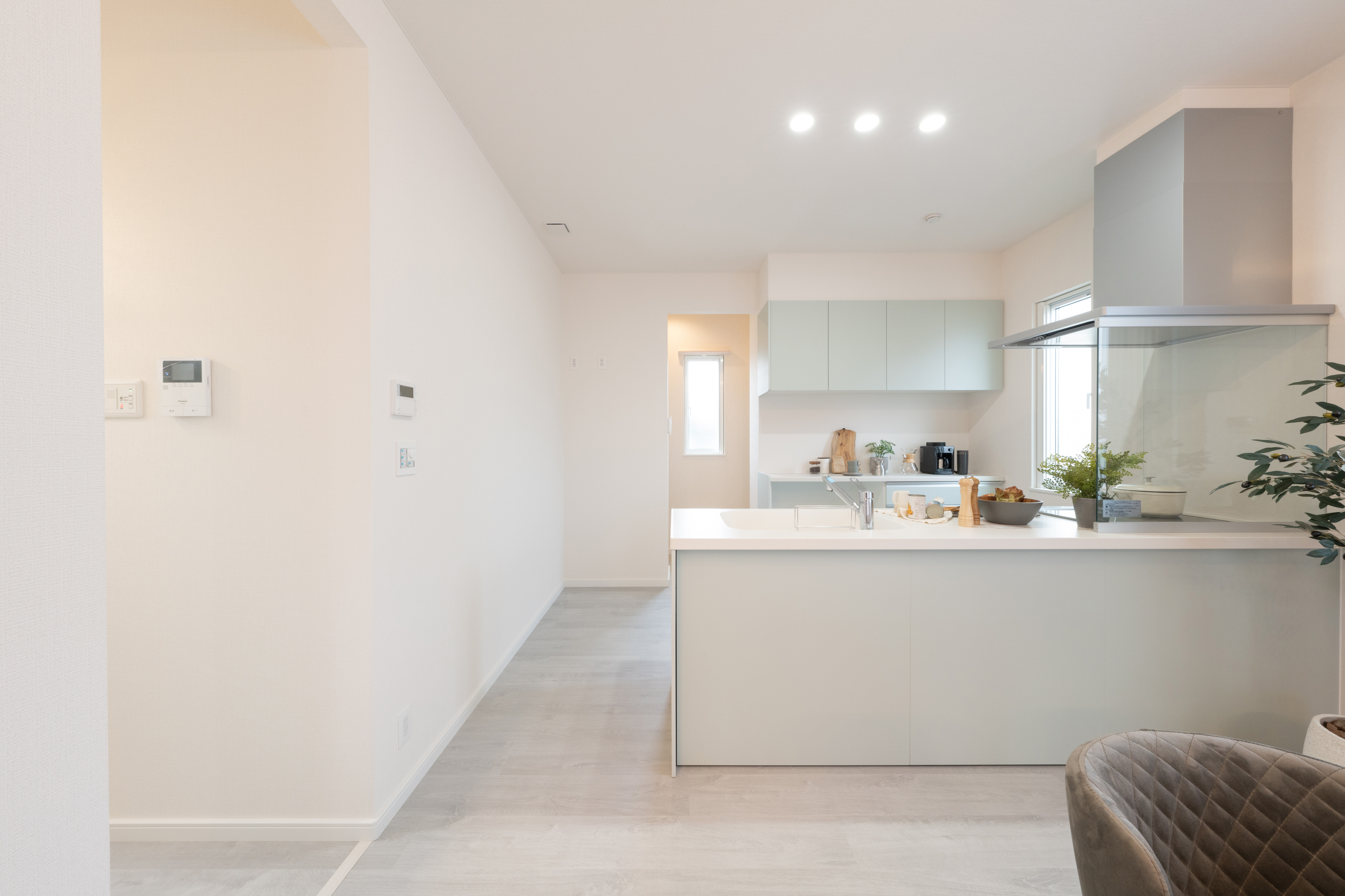 さわやかなグリーンのオープンキッチン。余白のあるシンプルな空間が引き立ちます。すっきりとした見え方にこだわりつつも、実は十分な容量の収納を確保しています。