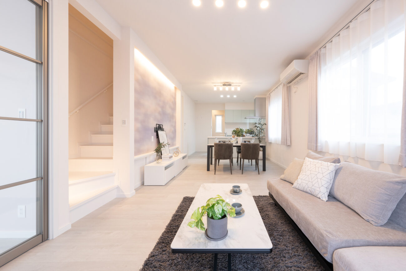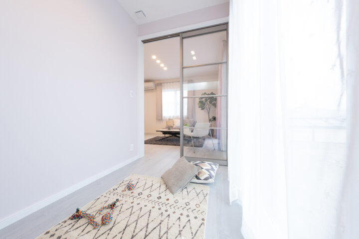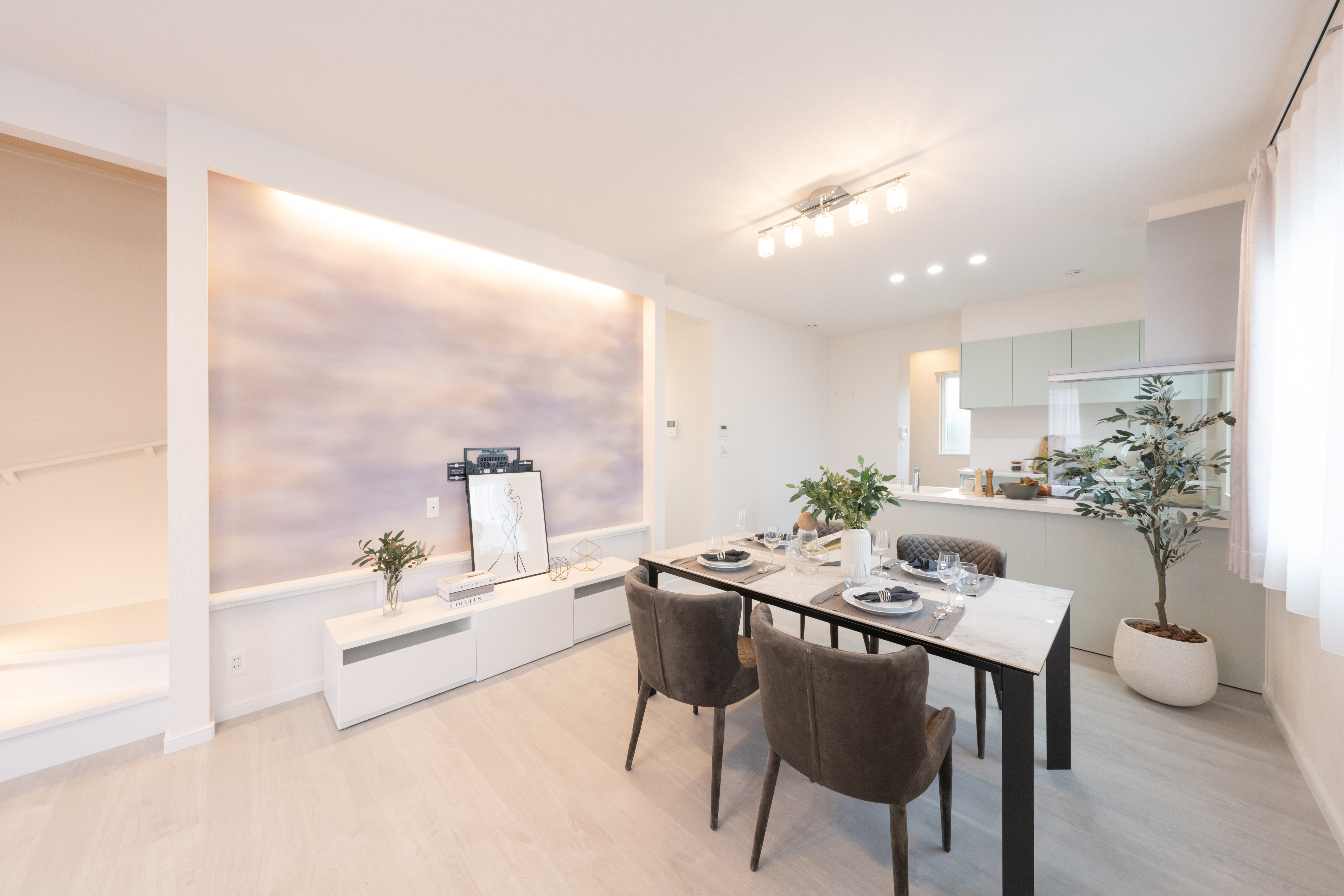 LDKの中心には幻想的なアクセントクロスを。ご家族のセンスが光る空間です。