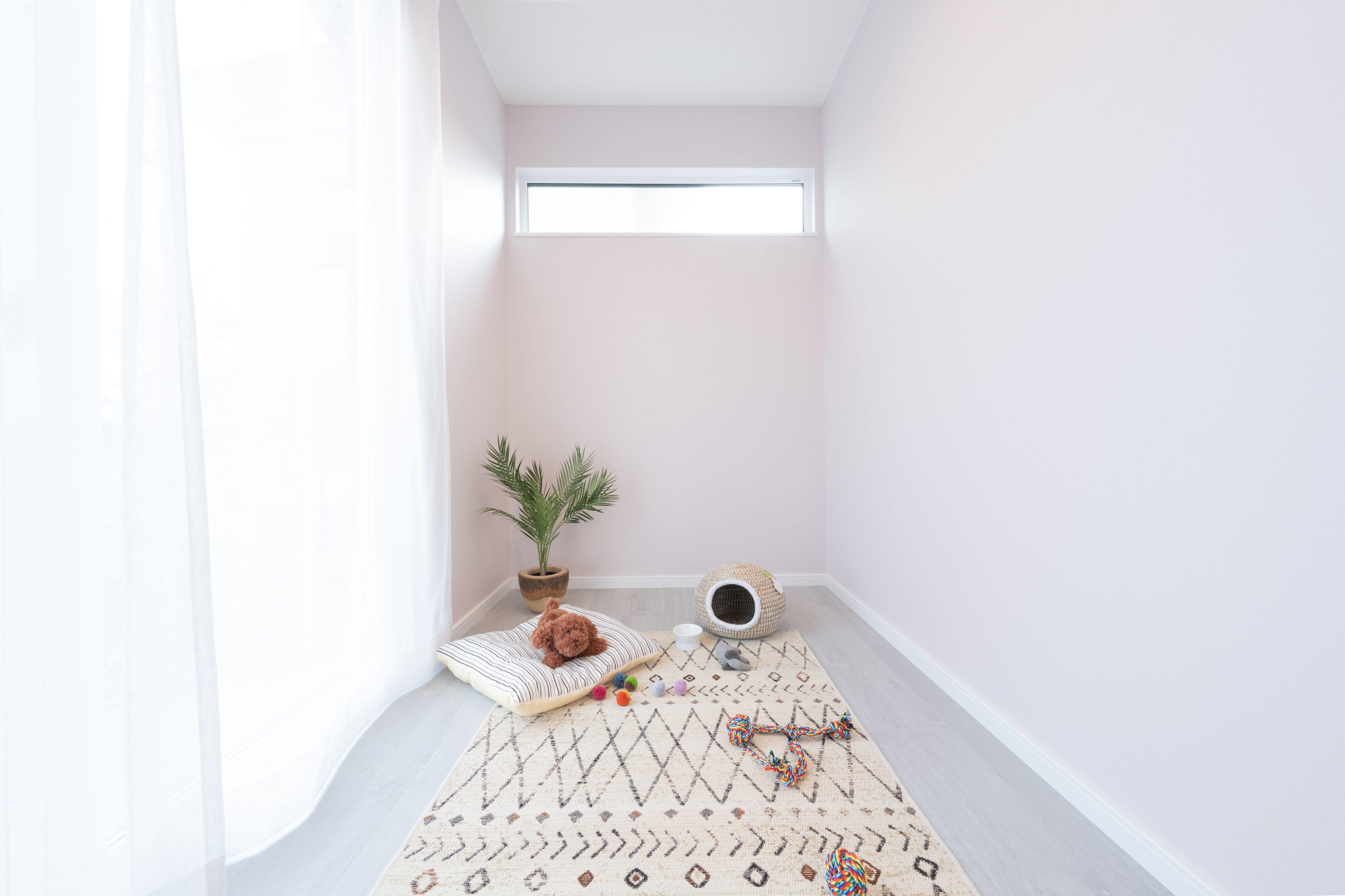 南側の一番気持ちの良い空間にワンちゃんのためのスペースを作りました。窓の外にはウッドデッキを設置し、プライベートなドッグランを作る予定。足を洗ってスムーズに室内に入れるように、外水栓も近くに配置しています。