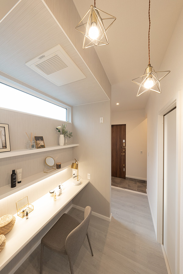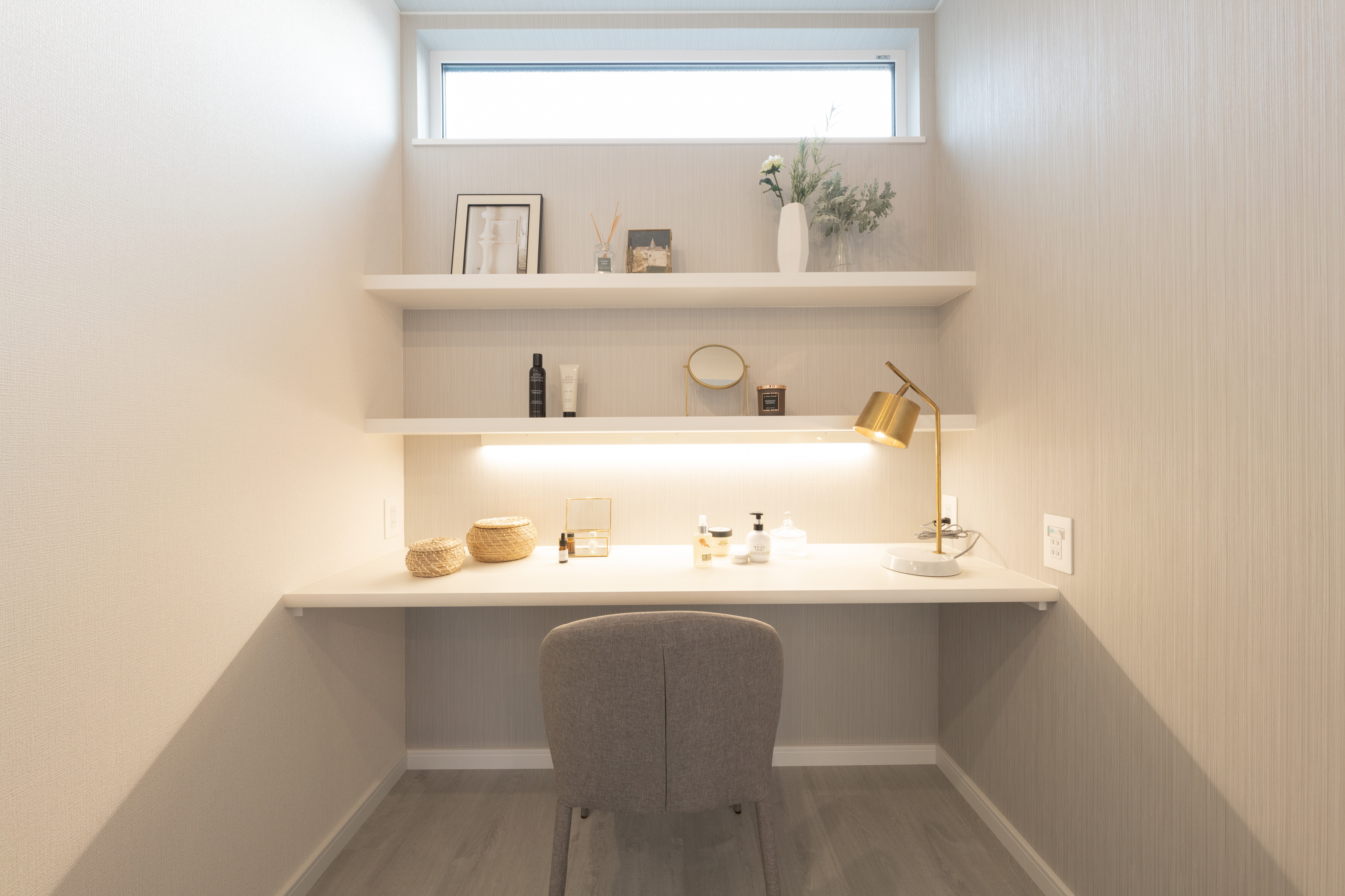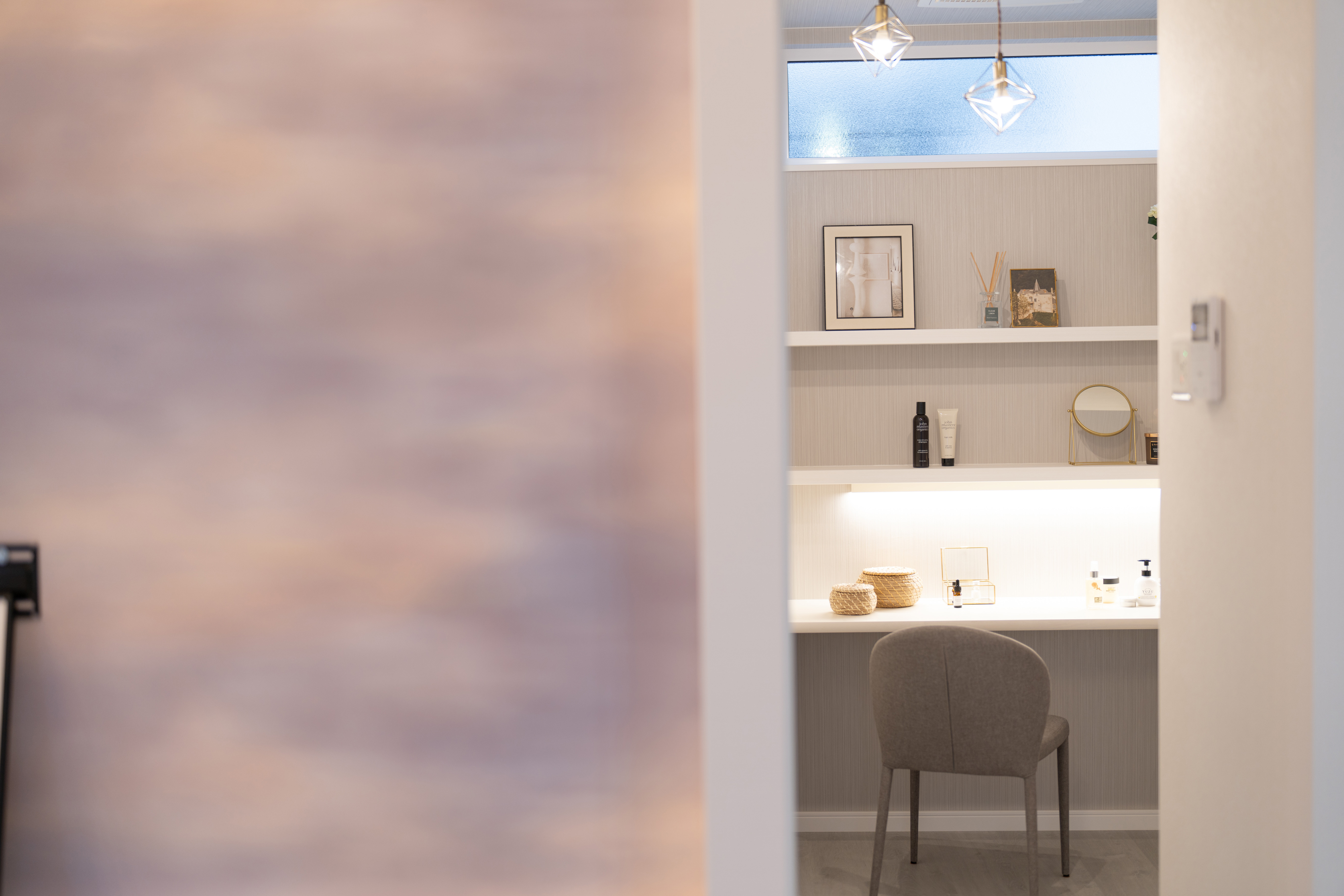 水回りには、洗面とは別にメイクルームを作りました。飾り棚につけた間接照明で、コスメショップのような華やかな空間に。お気に入りのコスメを飾ったり、いつかはお子様と並んでお化粧をしたりと、夢が膨らみます。