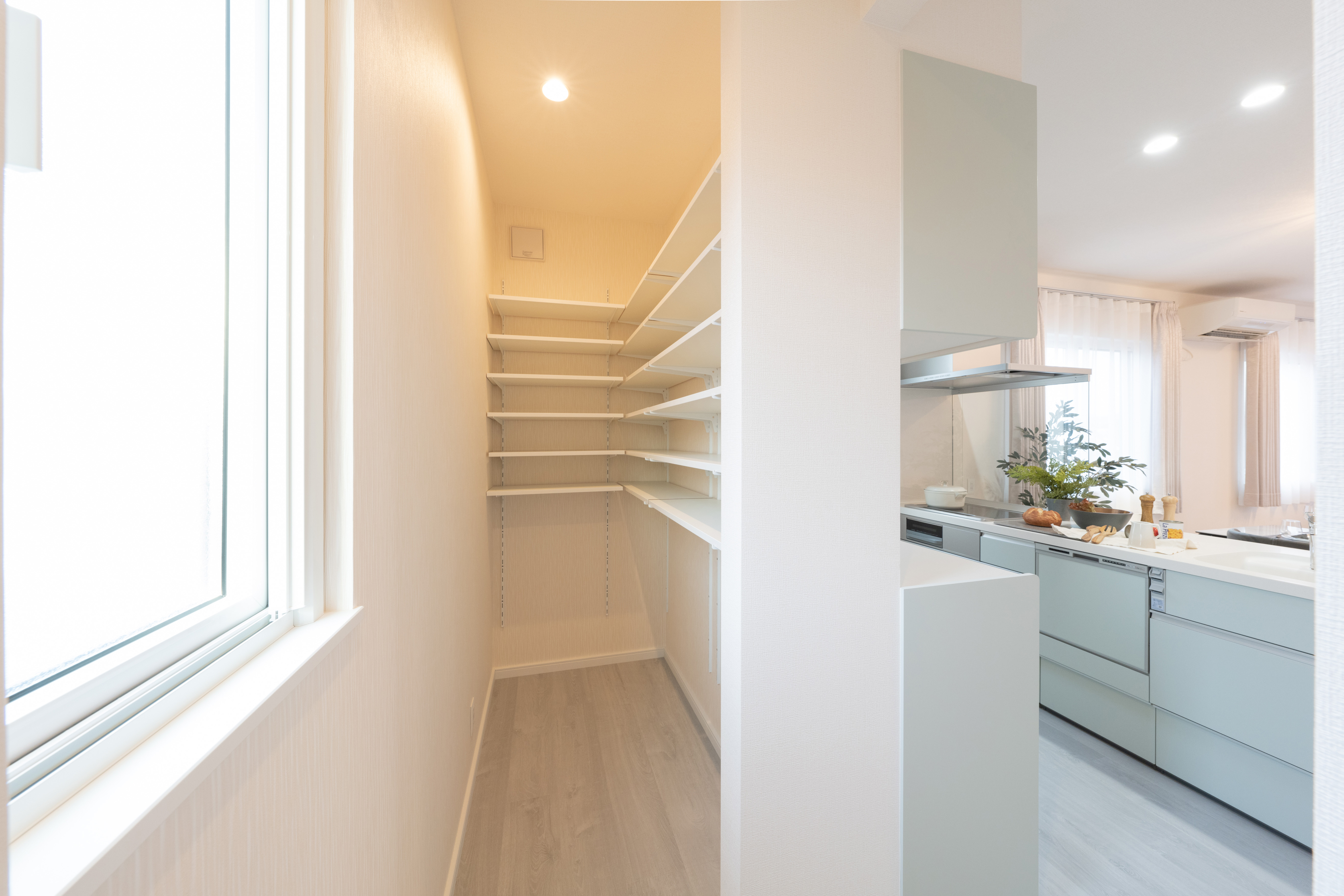 キッチンと同じ奥行きのある広々とした空間は、食料品はもちろん、災害時用の非常食の保管場所としても十分な広さです。