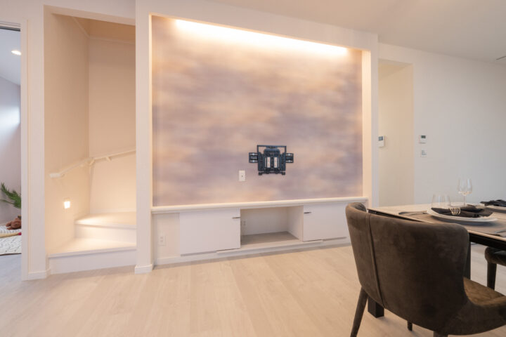 テレビ周りの配線は、壁の中に隠せる仕様。細やかな気配りで、空間全体が美しくまとまりました。