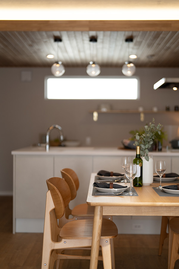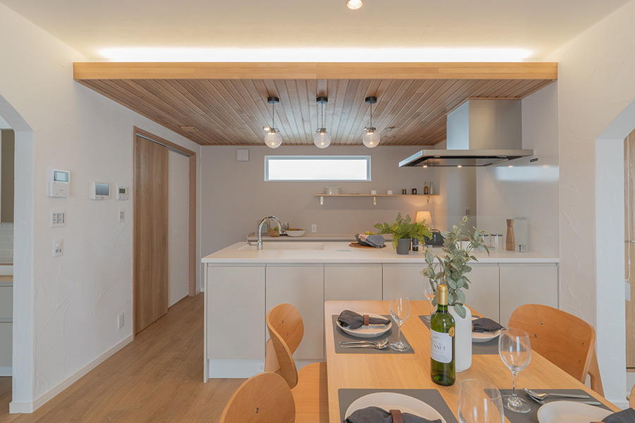ご夫婦ともにお料理をされるというM様のご希望で、オープンキッチンを採用しました。ダイニングよりも一段低い天井と板張りを採用した空間は、カフェのような居心地の良さ。飾り棚には、お気に入りの雑貨が並ぶ予定です。忙しい毎日に、気持ちのゆとりをもたらすポイントとなりました。