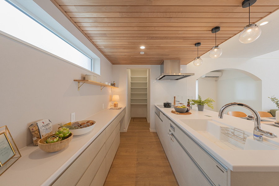 キッチングッズを数多くお持ちのM様。入居済みのオーナー様宅をご見学いただき、自分たちにとって必要なキッチン収納の容量を検討。大容量のカップボード収納に加え、パントリー収納も採用しました。