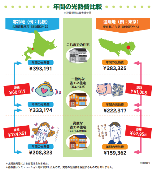 一般社団法人 住宅生産団体連合会の資料(下図参照)によると、これまでの住宅と性能の高い住宅を比較すると、寒冷地である北海道札幌市では年間光熱費が約6万~12.5万円、東京でも約6万円削減できることがわかります(計算根拠等の詳細は引用元ページをご確認ください)。