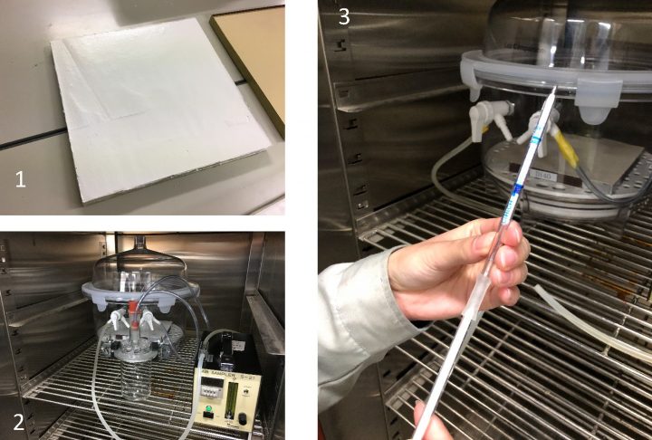 (写真)⽣活によって排出された有害なガスを吸着してくれる建築材料の性能試験。