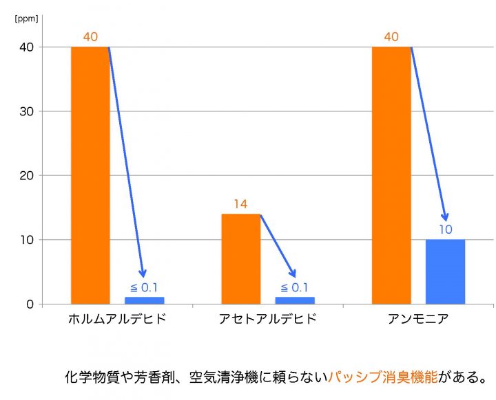 消臭機能のある内装材はこまめなメンテナンスや電⼒が不要で、安⼼して利⽤できる消臭法として期待を集めているのです。