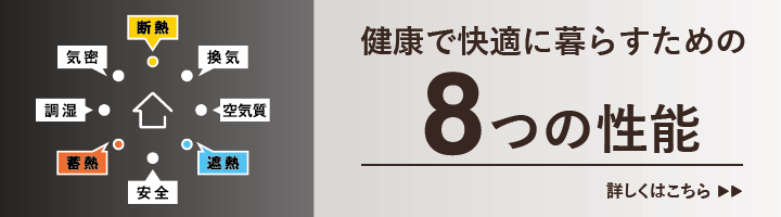 この8つの性能を「断熱・気密・遮熱・蓄熱・空気質・換気・調湿・安全」に分けて、わかりやすくお話します。