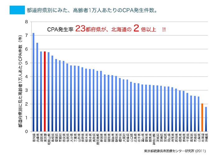積雪寒冷地で冬季間には非常に厳しい「寒さ」に見舞われる北海道と比較してみると、九州地区を含む23都府県の比較的温暖な地域の「心肺停止搬送(C P A)」リスクが、北海道の2倍以上にも達していることがわかります。