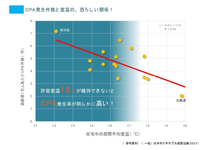 「C P A発生件数」は冬季間に急増することを併せて考えてみると、住宅内にある「寒さ」とC P Aリスクの間には、密接な相関関係があることが予見できます。