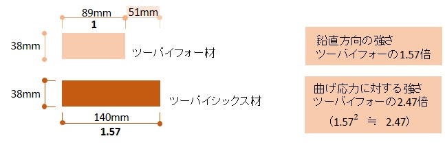 ツーバイシックスはツーバイフォーの約5cm幅の広い材になります。鉛直方向の力に対する強さは材幅に比例しますので、ツーバイフォーの約1.57倍となります。曲げ応力に対する強さは2乗に比例しますので約2.47倍となります。