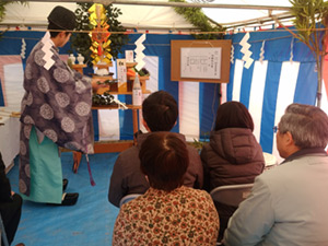 神様に工事の無事と、家の繁栄をお祈りします。お供え物をし、祝詞をあげ、お払いをして浄め、施主が初めてその土地に鍬(くわ)や鋤(すき)を入れます。