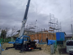 当社工場であらかじめ作成したパネルを、クレーンを使い組み立てていきます。