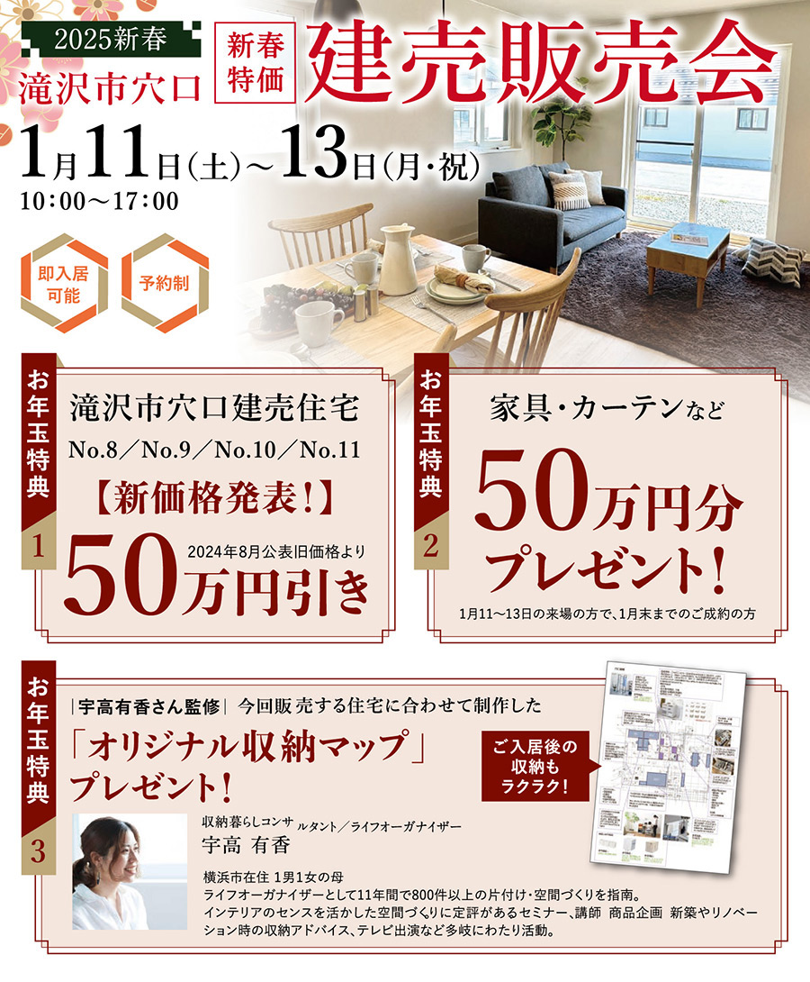 2025年1月11日(土)〜13日(月・祝)の3日間、滝沢市穴口で「[2025年新春特価]建売販売会」を開催いたします。