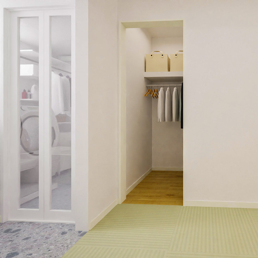 1階にファミリークローゼットがあることで、2階に洗濯物を持っていく手間を省け、洗濯動線を短縮し、家族の時間を増やします。