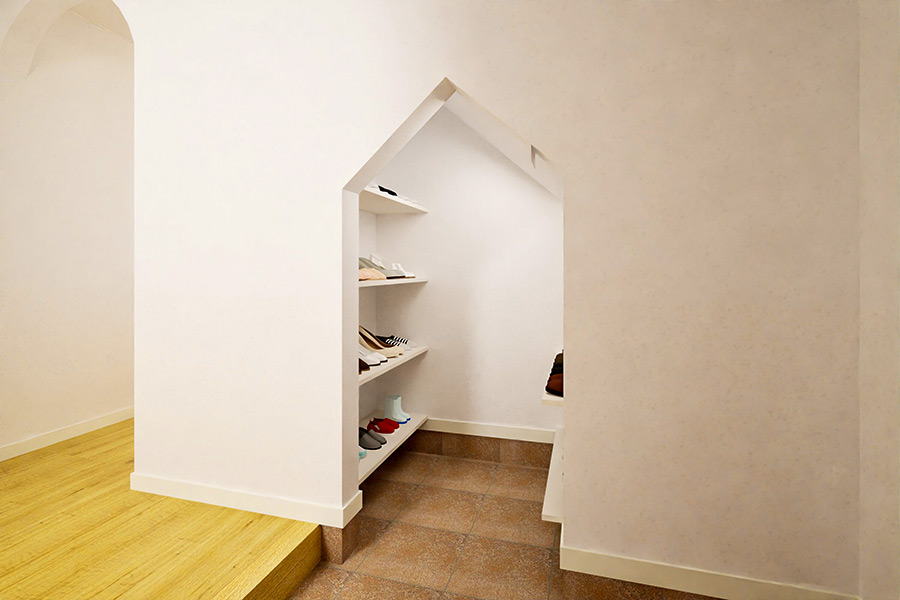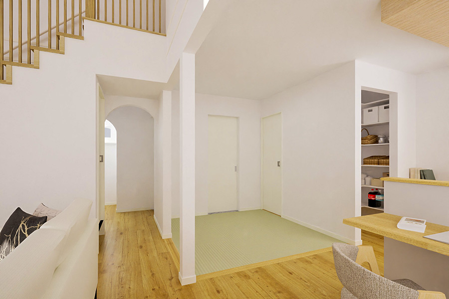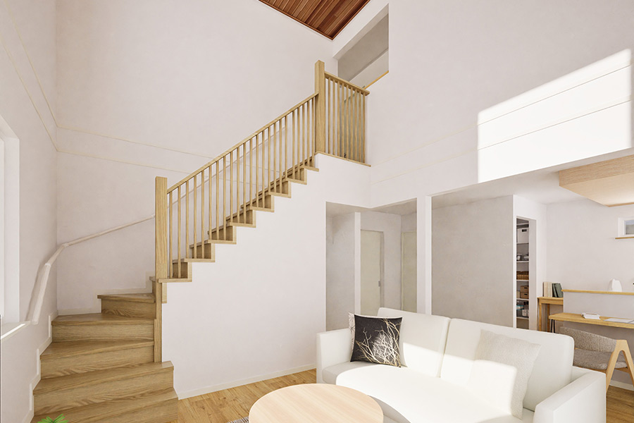 住まいがコンパクトなので、開放感をつくるために吹き抜けを設けました。廊下を抜けてすぐに吹抜けになることで、より開放感を得られる空間にしています。
