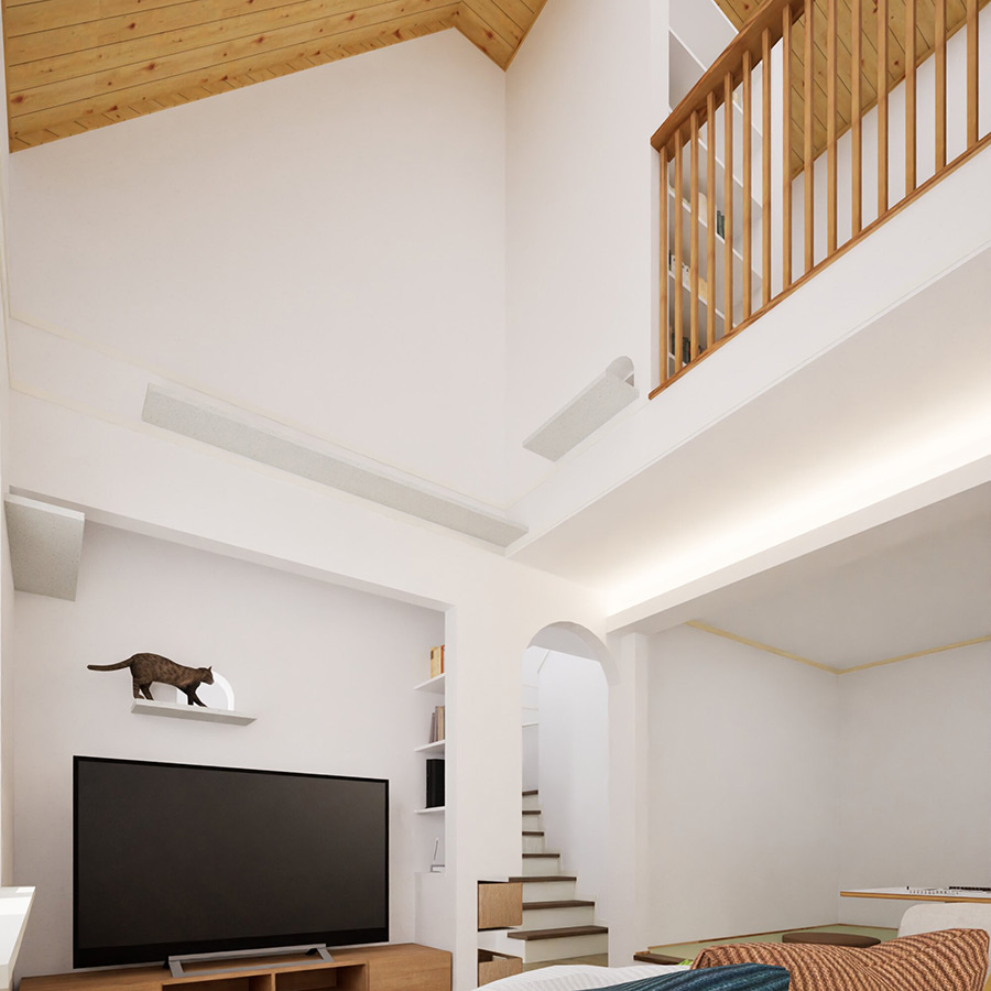 ネコちゃんと一緒に暮らす予定のため、吹抜けをネコちゃんの休む場所に想定しました。