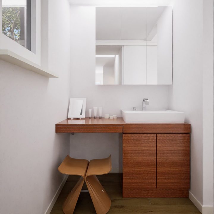 洗面コーナーは、奥様が座ってお化粧ができるように、広いスペースを確保しました。