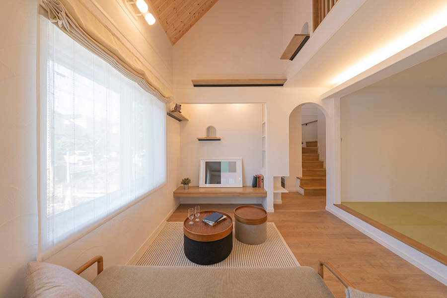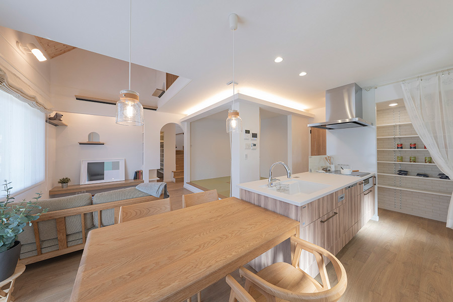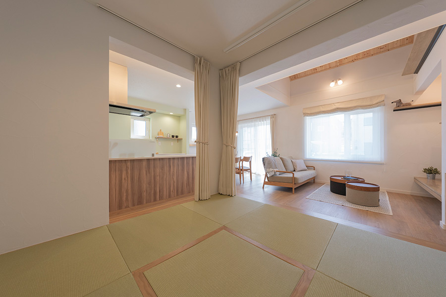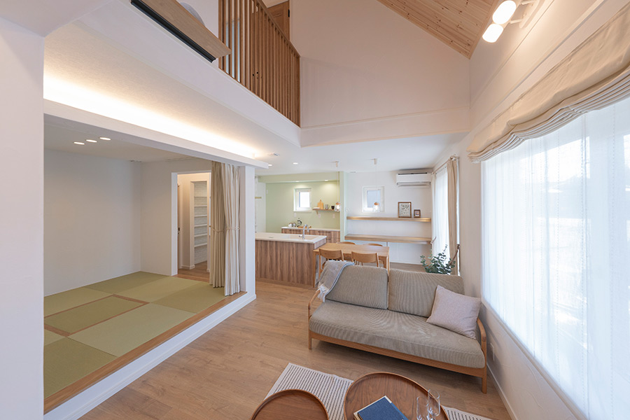 急勾配の大屋根の外観からは想像できないLDK+畳コーナーに、吹抜けを絡めた開放的な空間が内部に広がっています。