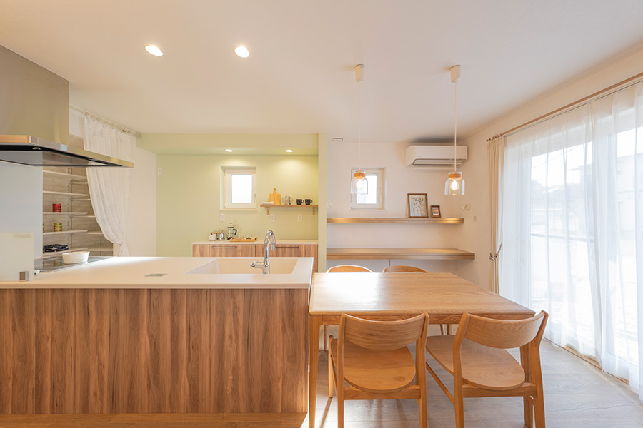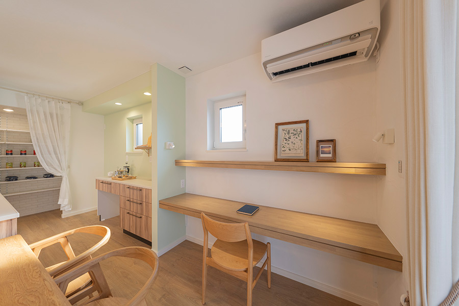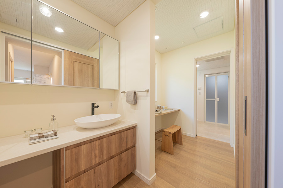 洗面コーナーは、奥様が座ってお化粧ができるように、広いスペースを確保しました。