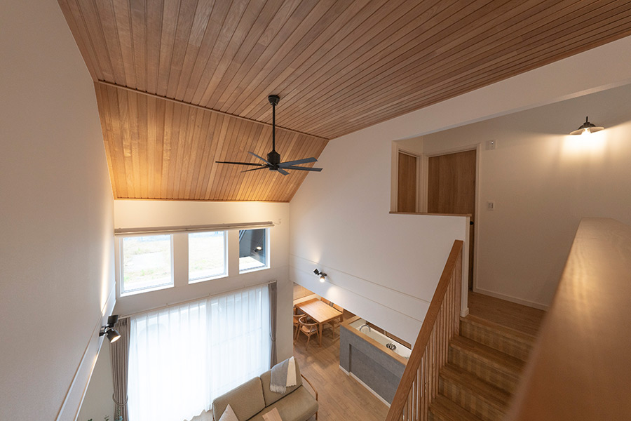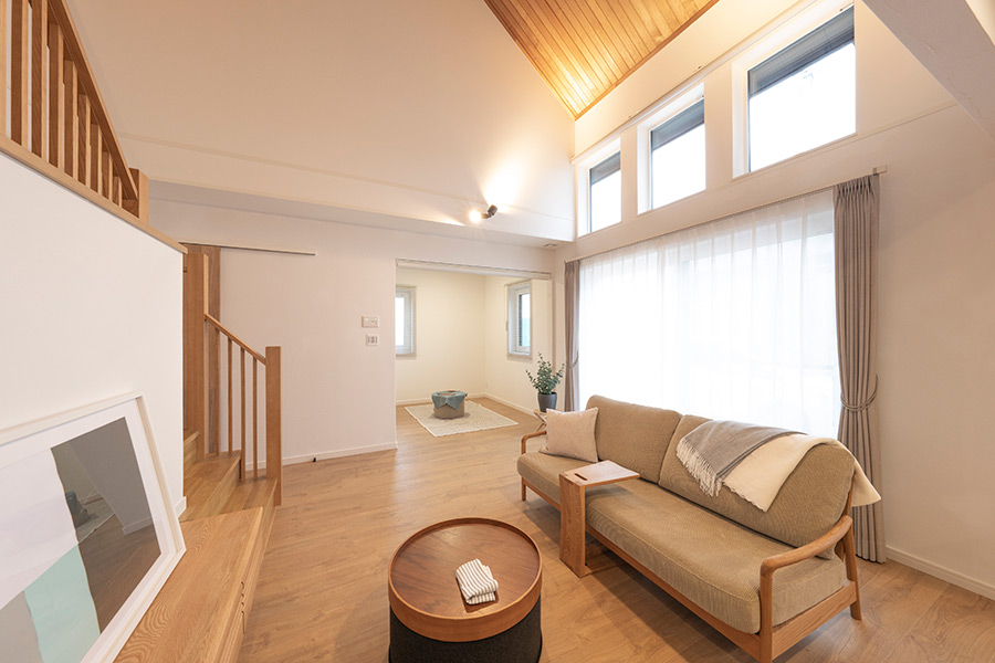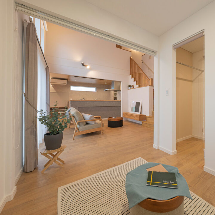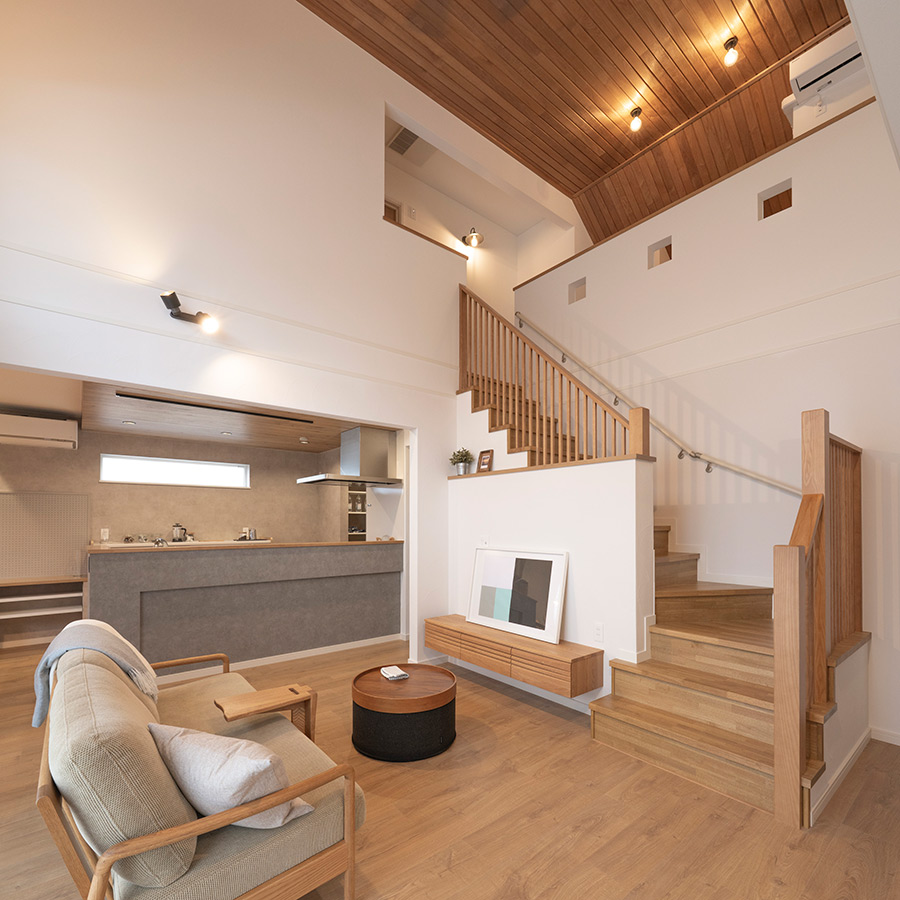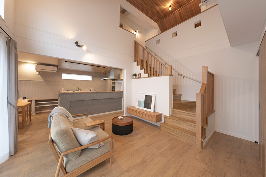 リビングからもダイニングキッチン、オールルーム、吹抜けと視線が伸びて、開放感がある空間です。