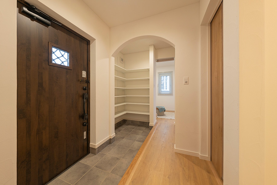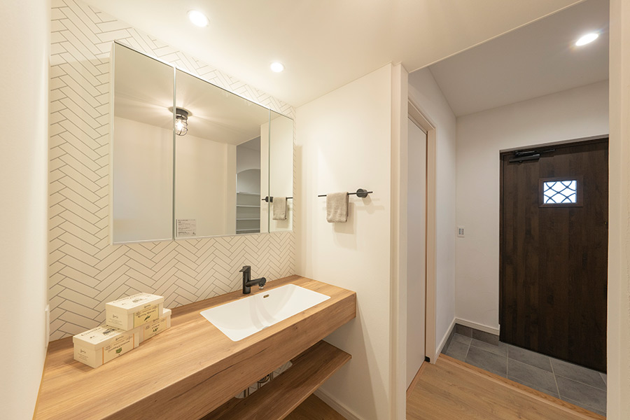 「洗濯動線とお子さんの準備動線をなんとかしたい」とご要望があり、玄関ホールから洗面化粧台→脱衣室→キッチンの動線をつくりました。