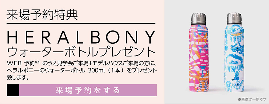 ※1:下部予約フォームから来場予約いただき、2見学会会場か、見学会会場と展示場にご来場いただいてアンケートに回答いただいたご家族様にヘラルボニーのウォーターボトルを1本プレゼント致します。なお、プレゼントは将来的に住宅の購入をご検討で、身分証明書をご提示いただける方、弊社にてアンケートにお答えいただいたことのないご家族様1回限りとさせていただきます。
