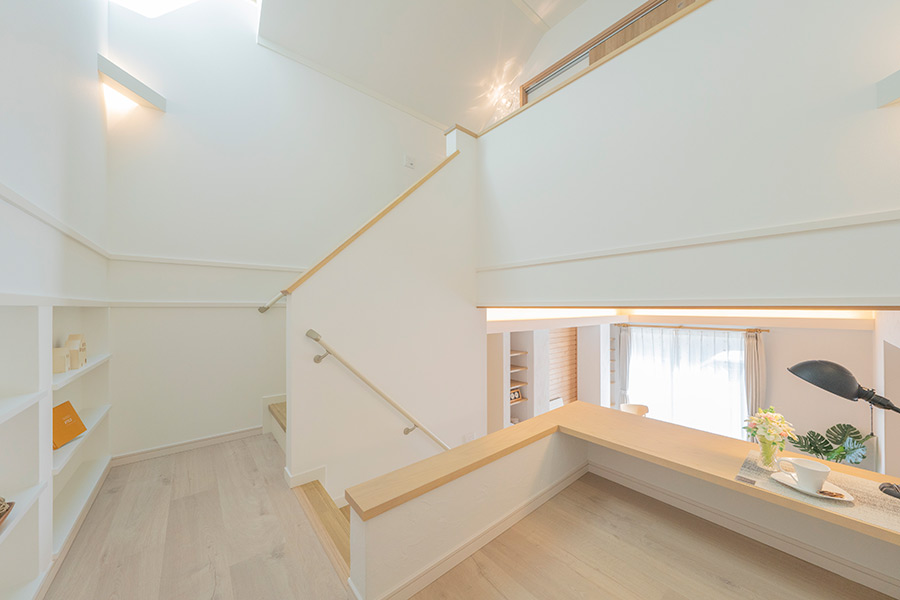 踊り場を使った中二階やその下のヌックスペース、ダイニングに続く畳コーナーなど、子供の居場所が複数ある住宅となっています。