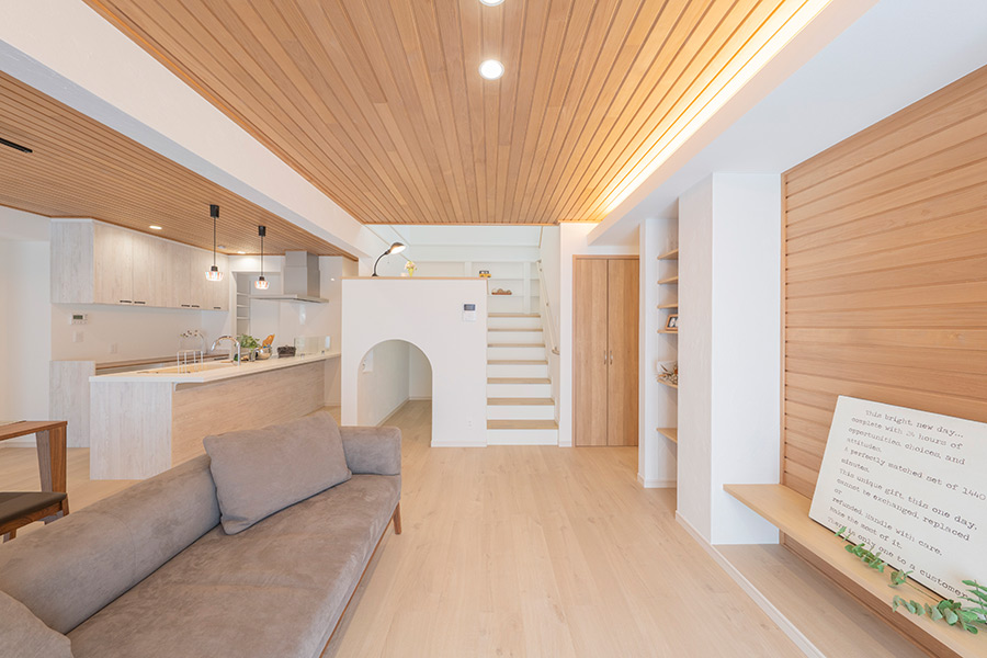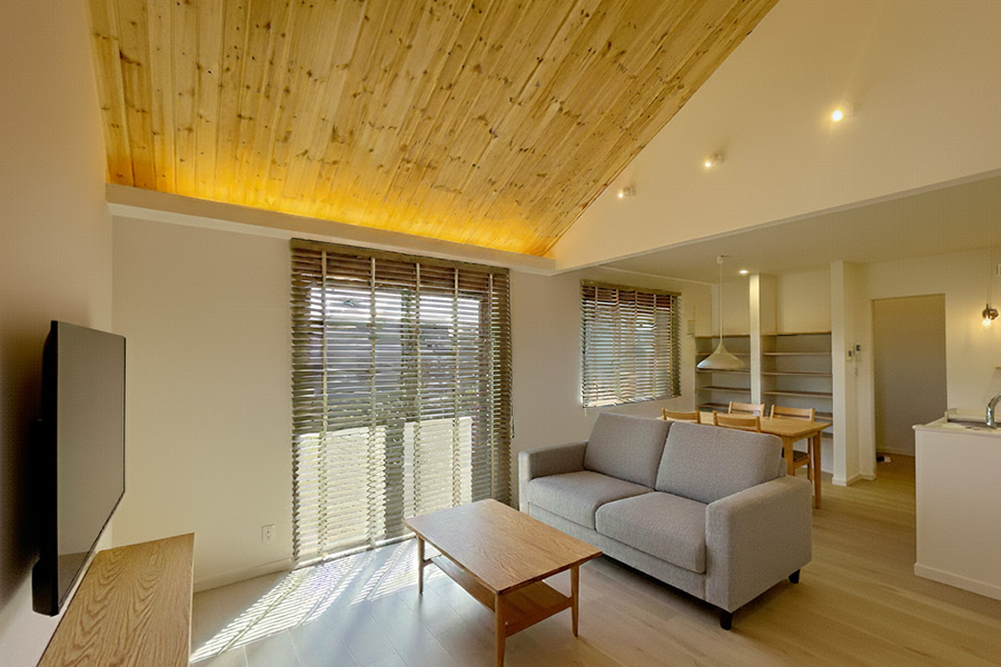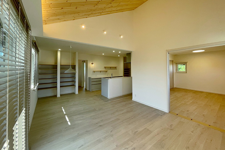 平屋ならではの勾配天井や、周辺敷地を読み解き、視線の抜けや借景を狙ったサッシなど、空間以上に広がりが感じられる平屋となっています。