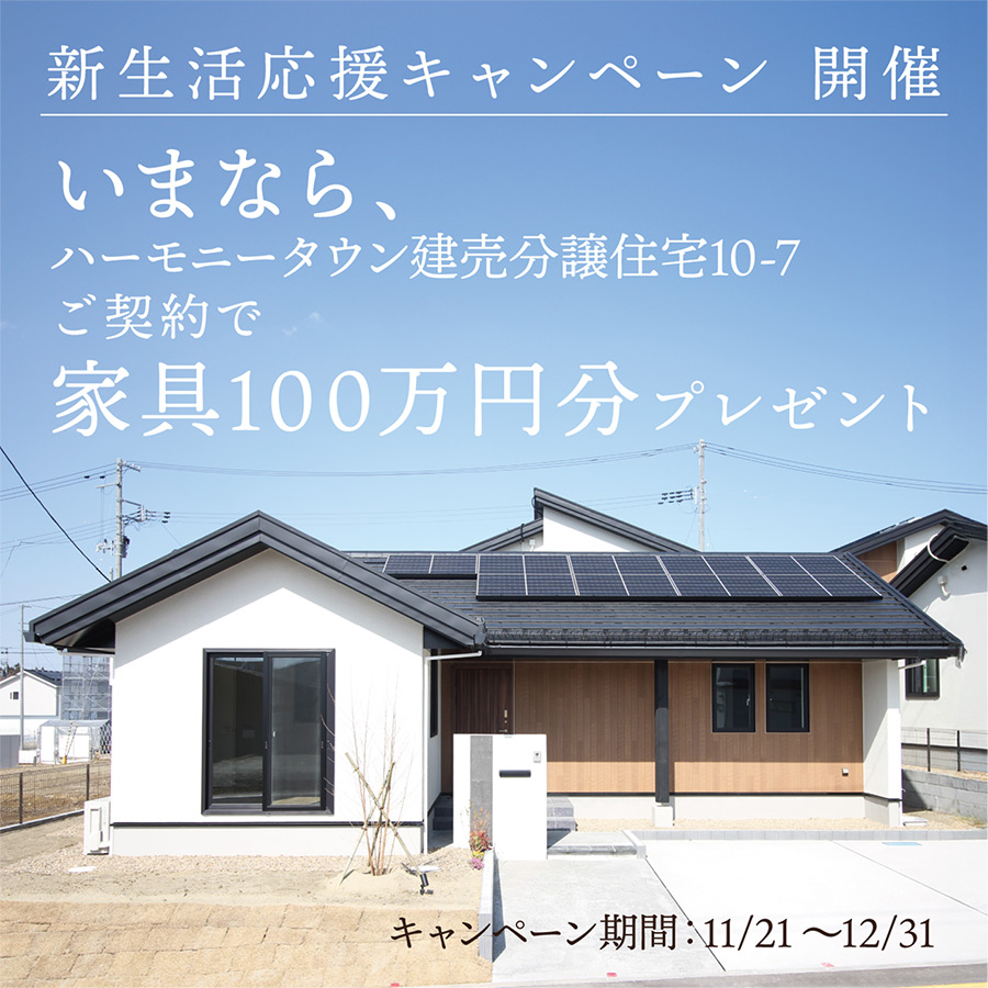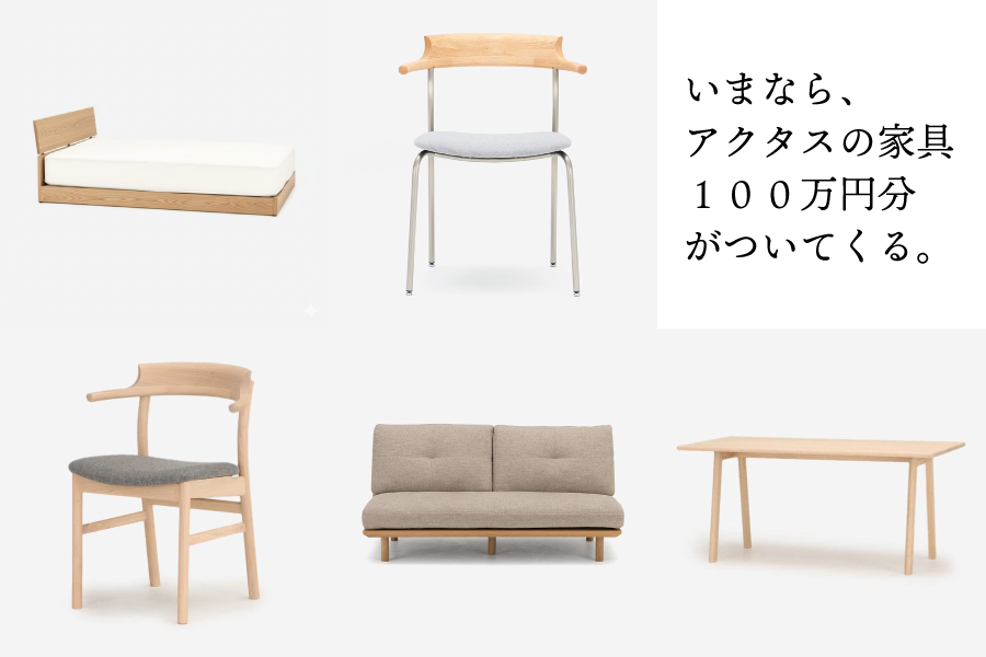 期間中に宮城県黒川郡大和町しあわせの杜10-7の建売分譲住宅をご契約いただくと、アクタスの家具100万円分をプレゼント致します。