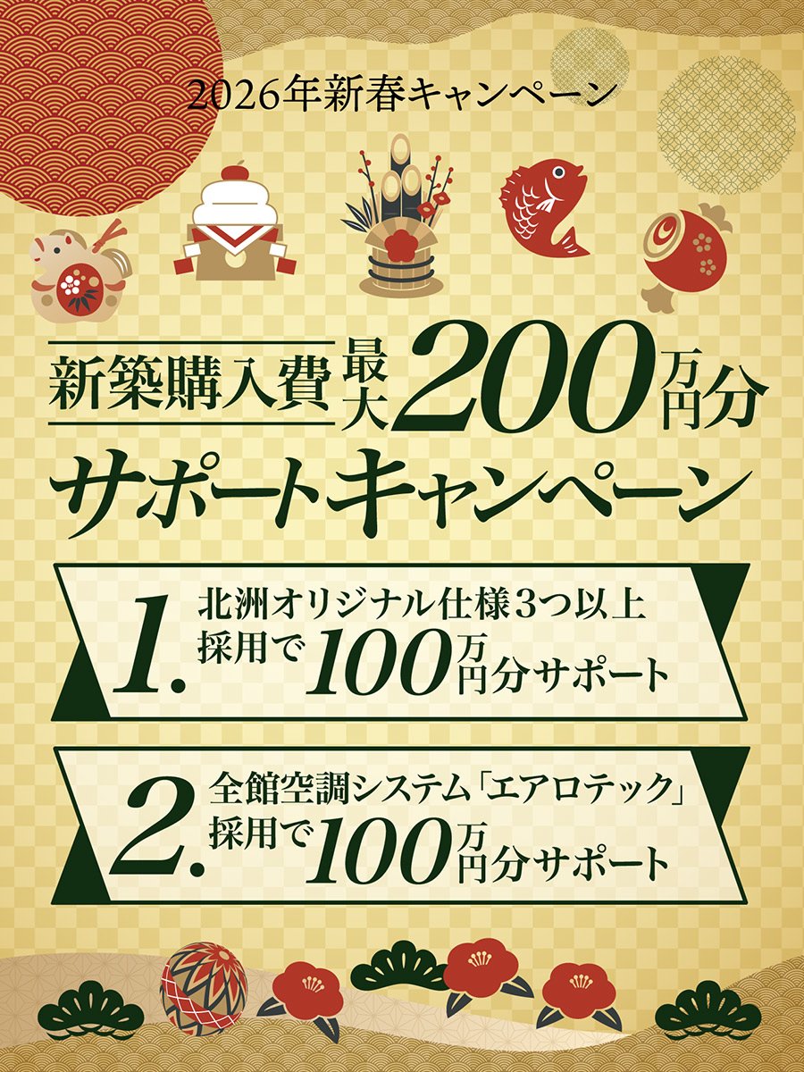 北洲ハウンジング仙台支店では「2026年新春キャンペーン」として、「新築購入費 最大200万円分サポートキャンペーン」を実施致します。