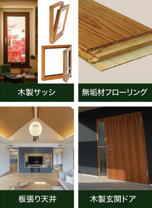 「北洲ダブル断熱」「木製サッシ」「無垢材フローリング」「板張り天井」「木製玄関ドア」のいずれかの商品を3つ以上ご採用いただくと、100万円分をサポートいたします。