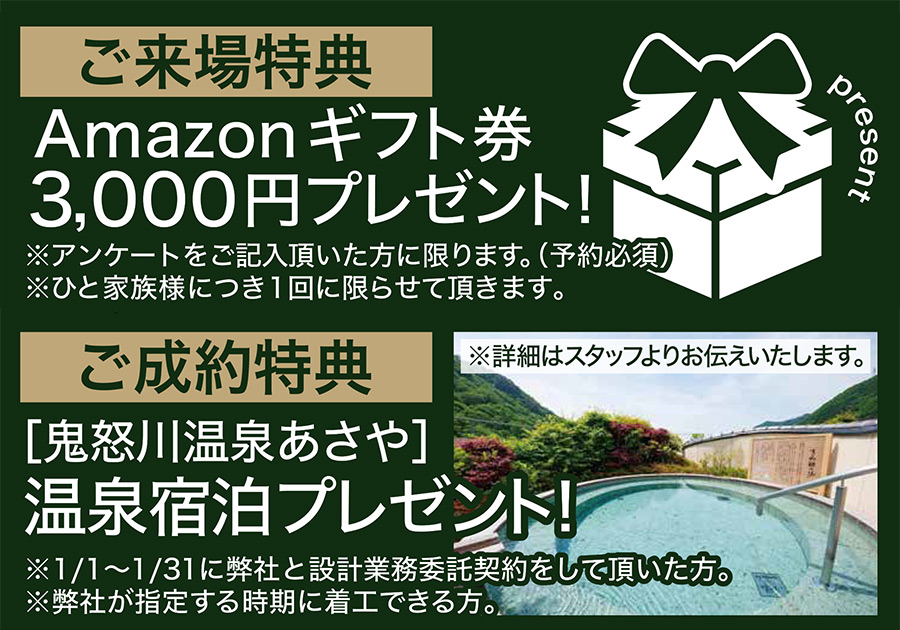 - ・下部予約フォームから展示場に来場予約いただき、ご来場いただいてアンケートに回答いただいたご家族様にAmazonギフトカード3,000円分をプレゼント致します。なお、プレゼントは将来的に住宅の購入をご検討で、身分証明書をご提示いただける方、弊社にてアンケートにお答えいただいたことのないご家族様1回限りとさせていただきます