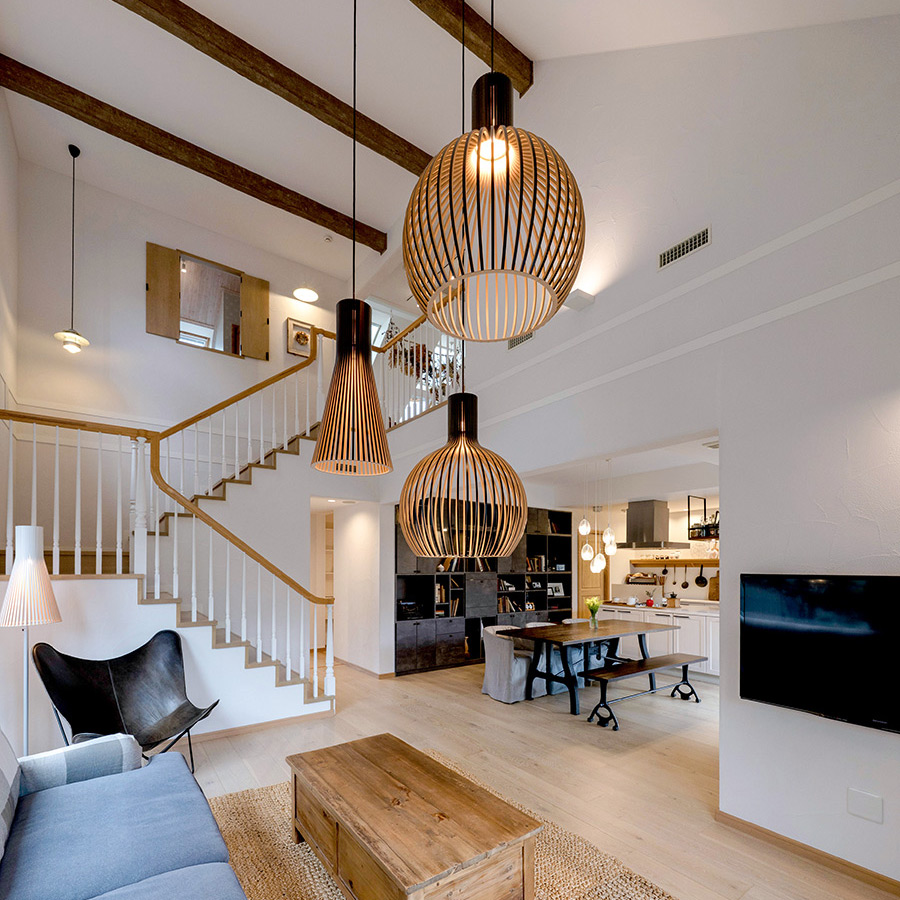 リビング、ダイニングからキッチンまで広がる開放感あふれる大きな吹き抜けと、窓から差し込むたっぷりの自然光が、ゆったり寛げる贅沢な空間をつくりだします。