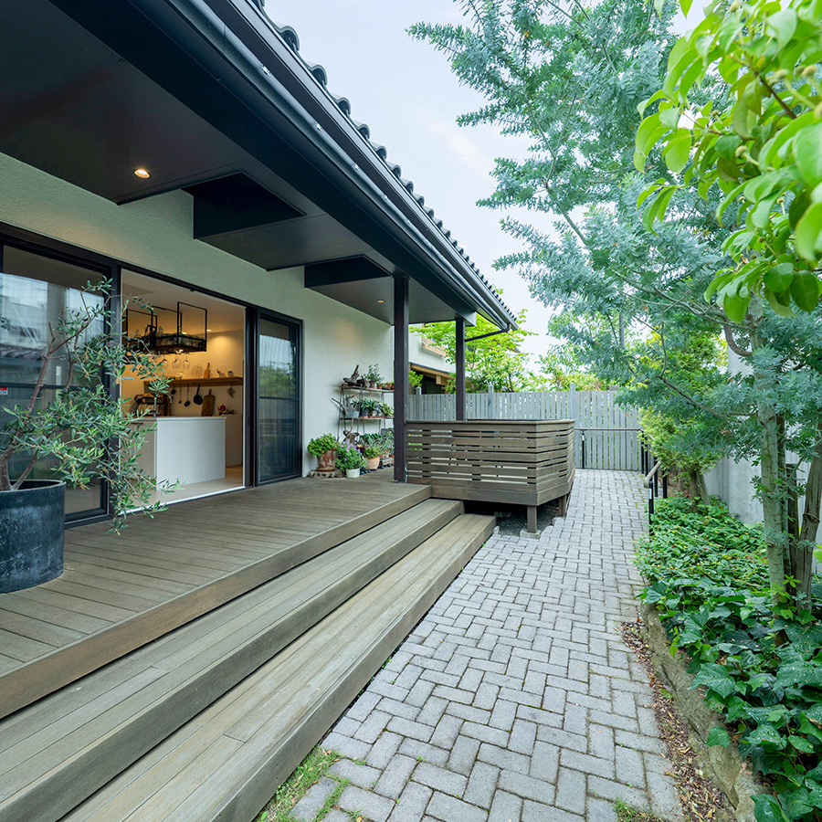 室内と外をゆるやかにつなぐ、軒下空間とウッドデッキが魅力的な住まいです。