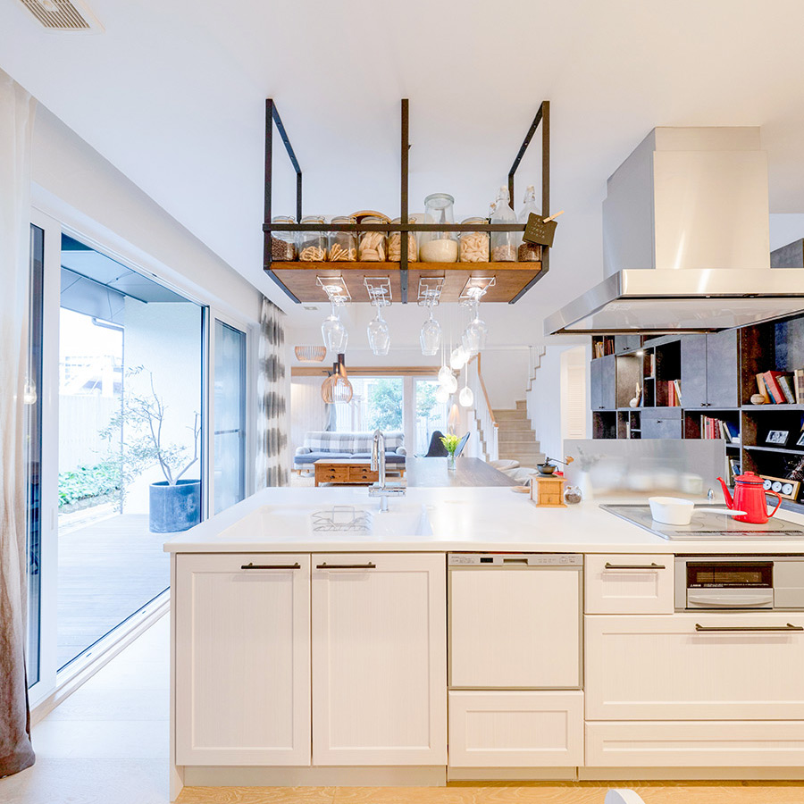 作業スペースが広く、家族やゲストと会話を楽しみながら料理ができるアイランドキッチン。