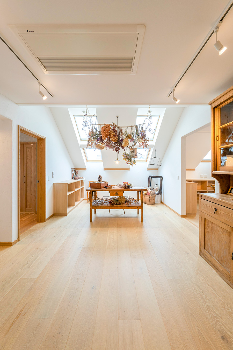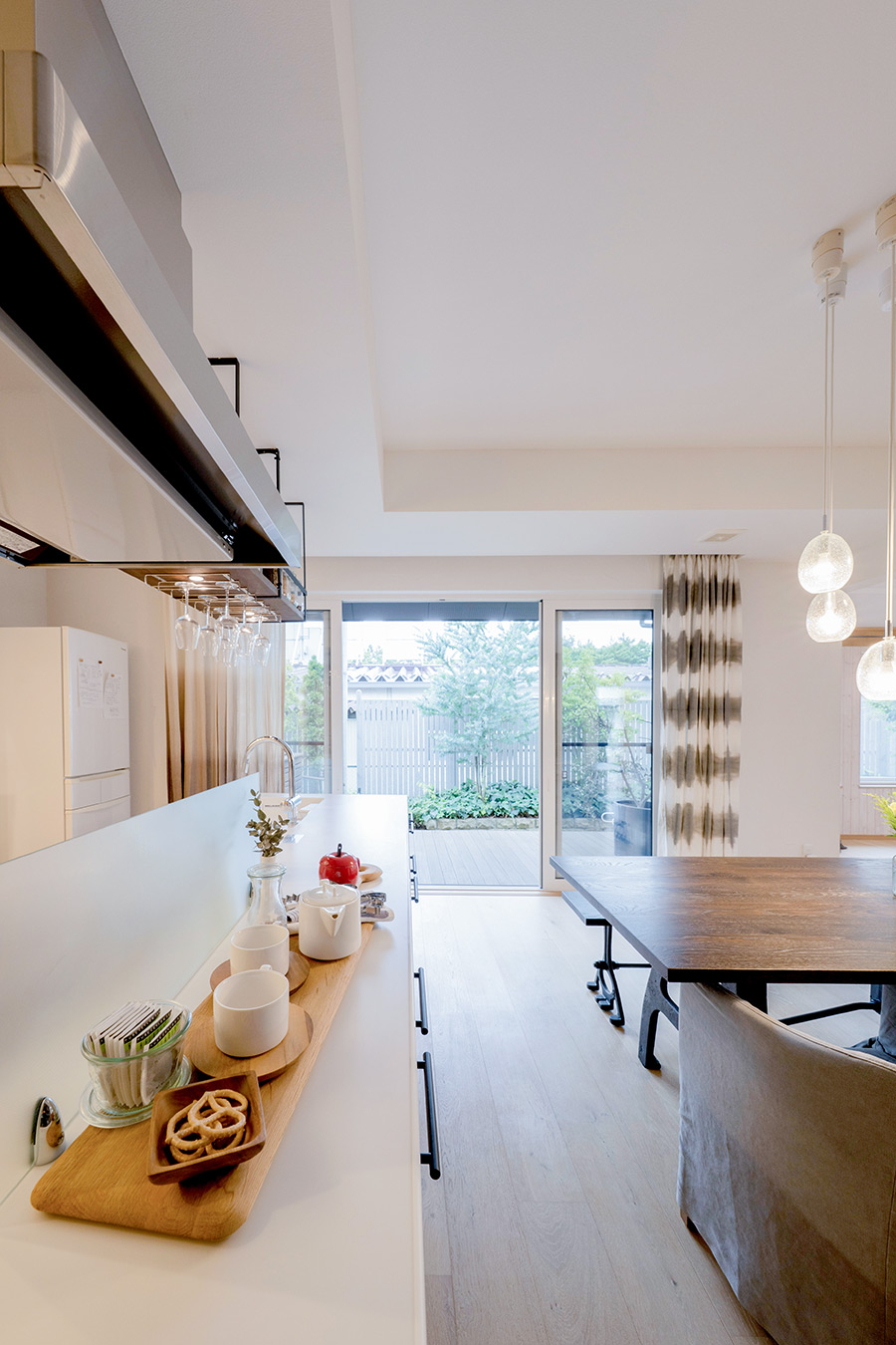 大きく開かれた窓からは、四季折々の表情を見せる庭の花々や家庭菜園の緑をすぐそばに感じることができ、日々の暮らしに潤いを与えてくれます。