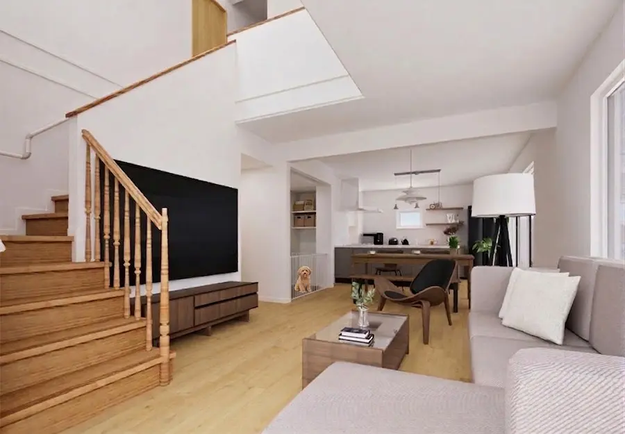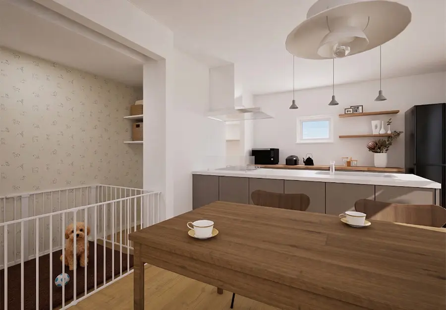 また、家族の一員としてのワンちゃんスペースをLDKの真ん中へ。LDKのどこにいてもワンちゃんを見守ることができます。